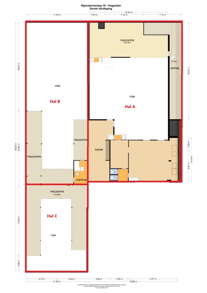 Het totale oppervlak van de betreffende hal is ca. 604 m² verhuurbaar vloeroppervlak, als volgt verdeeld:
