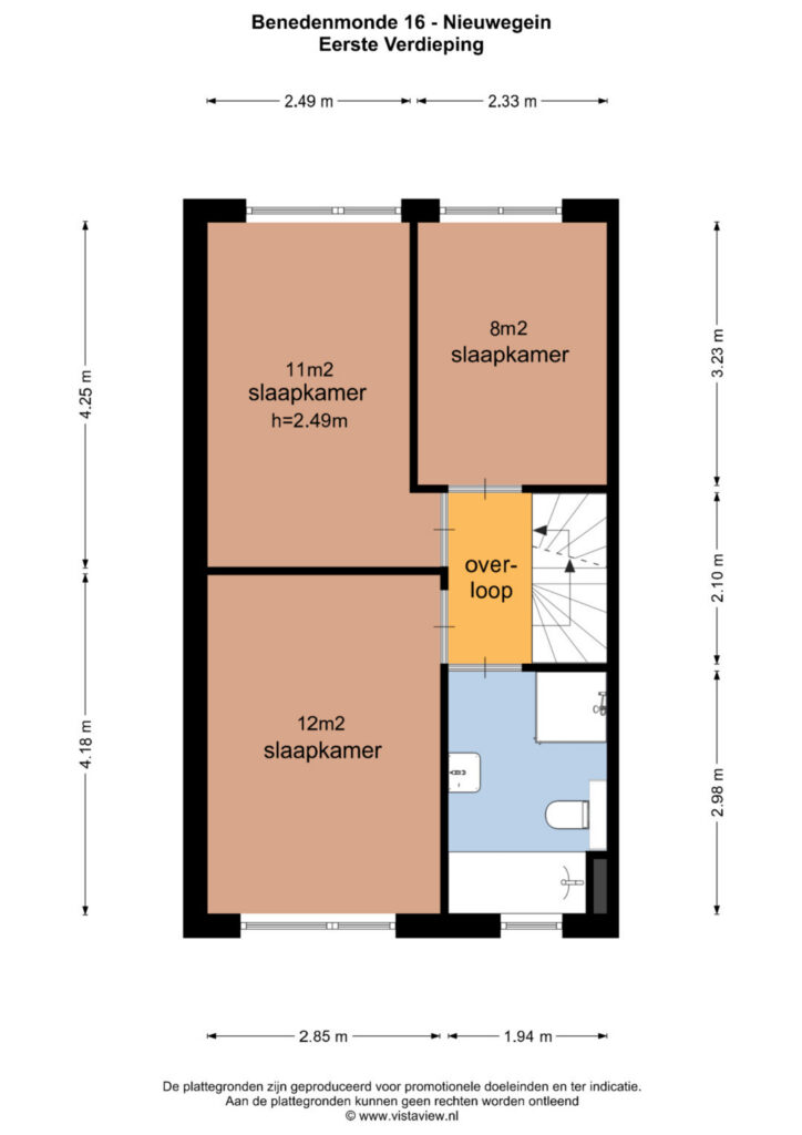 Drie slaapkamers van circa 8, 11 en 12 m² groot. Twee van de drie slaapkamers liggen aan de achterzijde van de woning. De badkamer ligt aan de voorzijde en is daardoor voorzien van raampartij voor extra licht en ventilatie. De badkamer is circa 6 m² met tweede toilet, ligbad en wastafelmeubel.