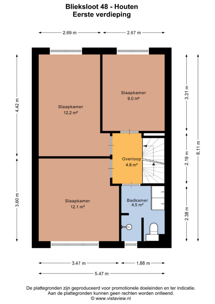 Op de eerste verdieping zijn drie ruime slaapkamers aanwezig: twee aan de achterzijde en één aan de voorzijde. De moderne badkamer is compleet uitgevoerd met een comfortabele inloopdouche, een wastafelmeubel met dubbele kraan en een tweede toilet.
