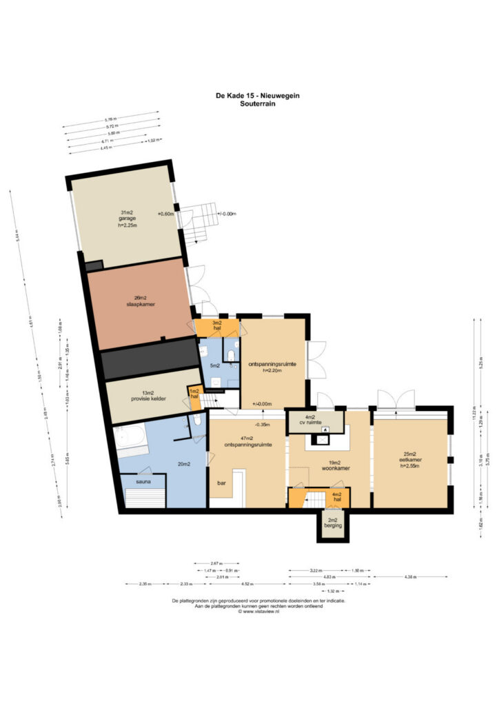 Aan de voorzijde heeft de woning twee verdiepingen, daar zie je de 554 m² woonruimte niet zozeer, aan de achterzijde is de ruimte bet zichtbaar: hier zijn de drie verdiepingen goed zichtbaar. Het souterrain is door zijn verrassende vetrekken en ruime indeling een volwaardige verdieping.