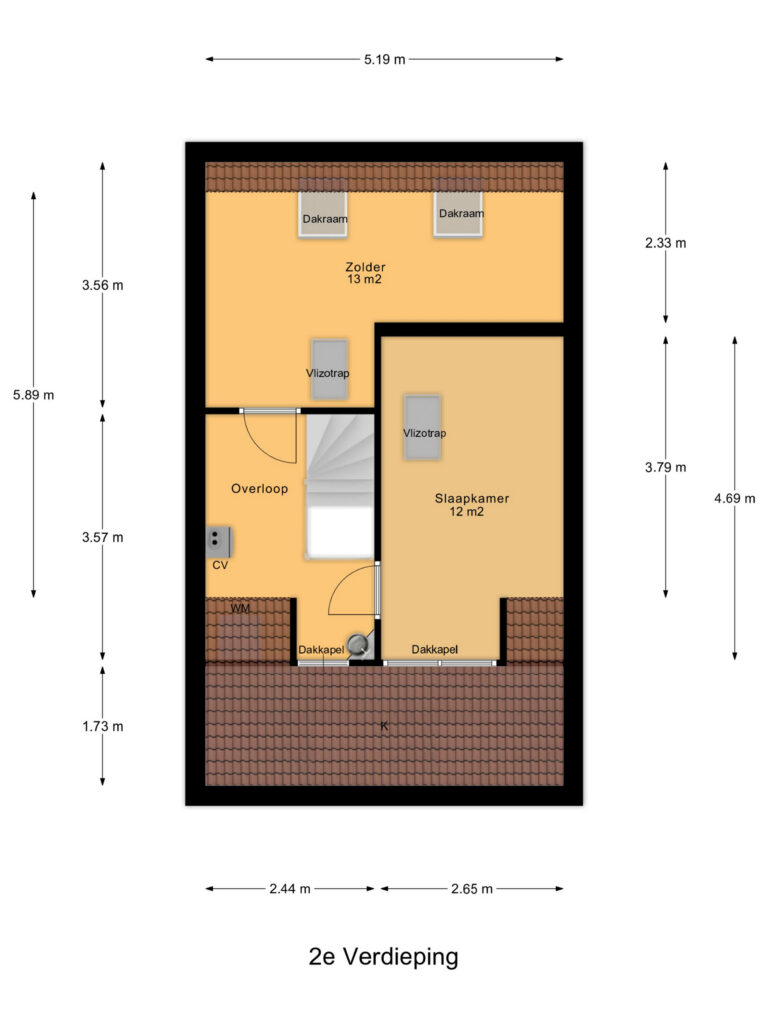 De tweede verdieping is vergroot met een dakkapel en biedt nog eens twee extra kamers: een slaapkamer met wateraansluiting en een tweede kamer die uitstekend geschikt is als werk-, hobby- of logeerkamer. Op de overloop vindt u de wasmachineaansluiting, de cv-ketel en toegang tot de bergvliering. De zolder is voorzien van PVC.
