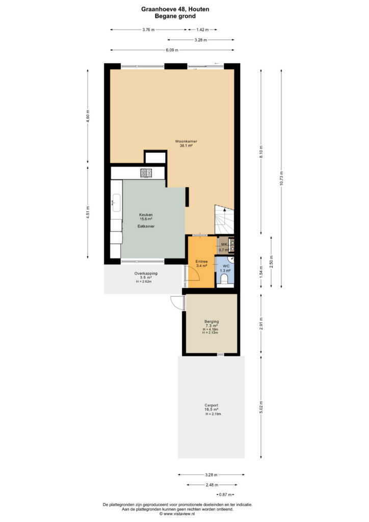 After parking your car in your private driveway under the carport, you enter the home through the front garden. Before stepping inside, you'll find a convenient storage room next to the entrance, equipped with a large rainwater tank of over 1,400 liters, which supplies the toilets. The entrance hall features a toilet with a wall-mounted toilet, sink, and radiator, as well as the meter cupboard. From the entrance, you can go left into the semi-open kitchen or straight into the living room, where the staircase to the first floor is located on the right. Thanks to the large windows, the living room enjoys an abundance of natural light and a lovely view of the greenery.