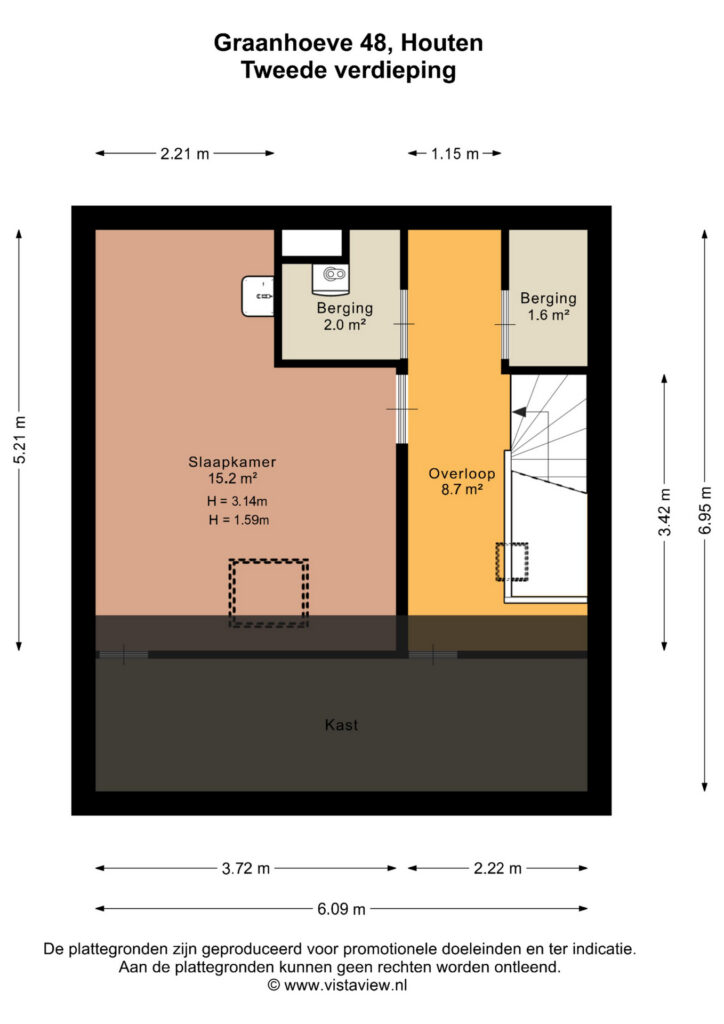 Aangekomen op de tweede verdieping tref je eerst de ruime overloop. Aan de rechterzijde beschik je over een separate bergruimte en hier tegenover bevindt zich de separate technische ruimte waar de cv-combi zich bevindt. Tot slot vind je op zolder nog een slaapkamer met vaste wastafel van maar liefst ruim 15 vierkante meter.