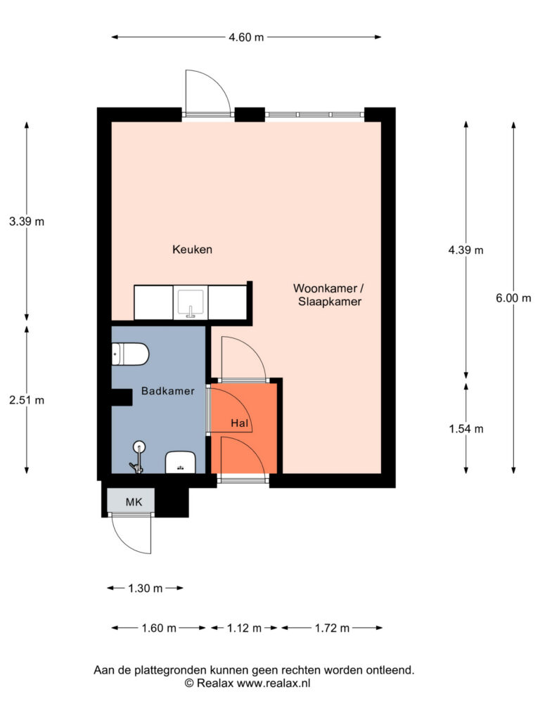 Via de hal bereik je de badkamer met toilet, douche en wastafel. De woonkamer/ slaapkamer is erg licht door de raampartijen.