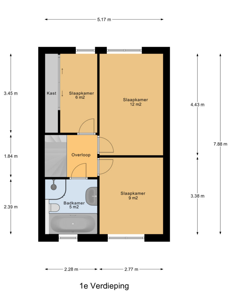 Overloop, drie slaapkamers van respectievelijk 9, 12 en 8 m² groot. Alle ruimtes zijn goed en netjes afgewerkt.