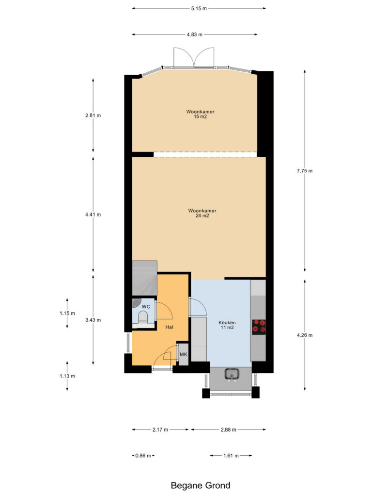 Entrance with side window, meter cupboard, toilet and staircase. Access to the living room. The living room is bright thanks to the large rear window and the bay window at the front, and offers a full-width view of the garden.