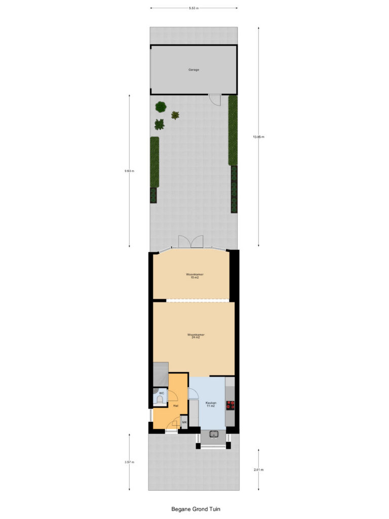 The pleasant and spacious backyard offers plenty of privacy and freedom, faces the sunny west, and includes a garage on the property. Due to the generous plot size, the garden remains nicely spacious despite the extension and the garage.