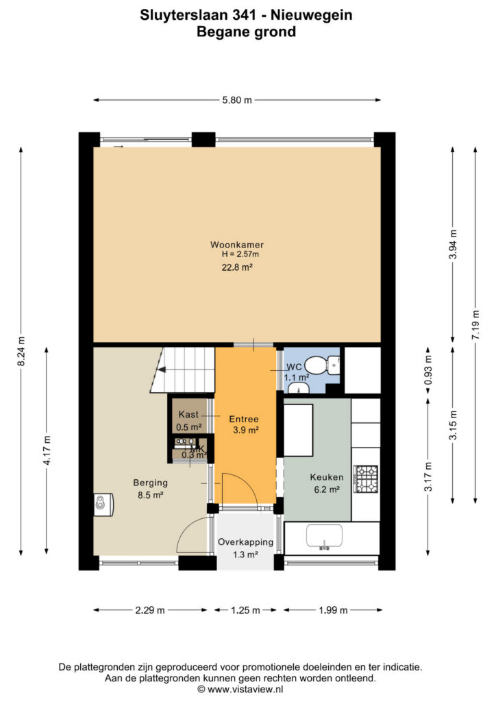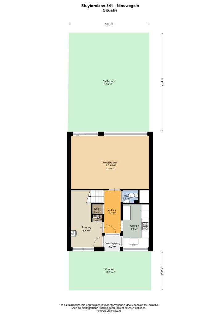 Entree, toegang naar de berging, keuken en woonkamer. De berging is circa 8,5 m², hier is ook de opstelling van de cv-ketel. De keuken ligt aan de voorzijde van de woning, is gesloten ten opzichte van de woonkamer en is in L-vormige opstelling geplaatst. Door de twee grote raampartijen is er veel natuurlijk daglicht. De keuken is circa 6 m² groot. De woonkamer is circa 23 m² groot en tuingericht. De tuin is heerlijk gelegen op het zuiden en circa 44 m² groot. Er is een elektrisch zonnescherm aanwezig.