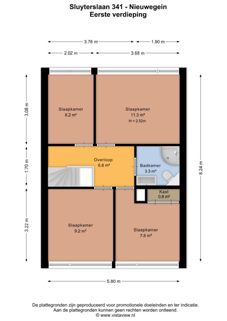 Maar liefst vier slaapkamers, goed bemeten met een oppervlakte van circa 6, 8, 9 en 11 m² groot. Twee slaapkamers liggen aan de voorzijde en twee aan de achterzijde van de woning. De slaapkamer van circa 8 m² groot is voorzien van vaste kast. De badkamer ligt in het midden van de woning en is circa 3.3 m² groot. De badkamer is voorzien van douche, wastafelmeubel en toilet. De badkamer is in witte kleurstelling.