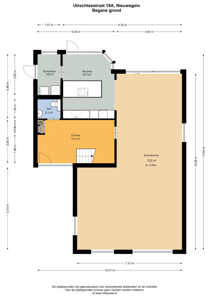 Entree, hal, toilet, trapopgang en toegang tot de woonkamer. De woonkamer heeft een mooie L-vorm en is in totaal 72 m² groot. De keuken staat op een mooie wijze in verbinding met de woonkamer en is met 16 m² royaal. Er is veel berg- en werkruimte, alle wenselijke inbouwapparatuur is aanwezig en het kookeiland maakt het geheel compleet.