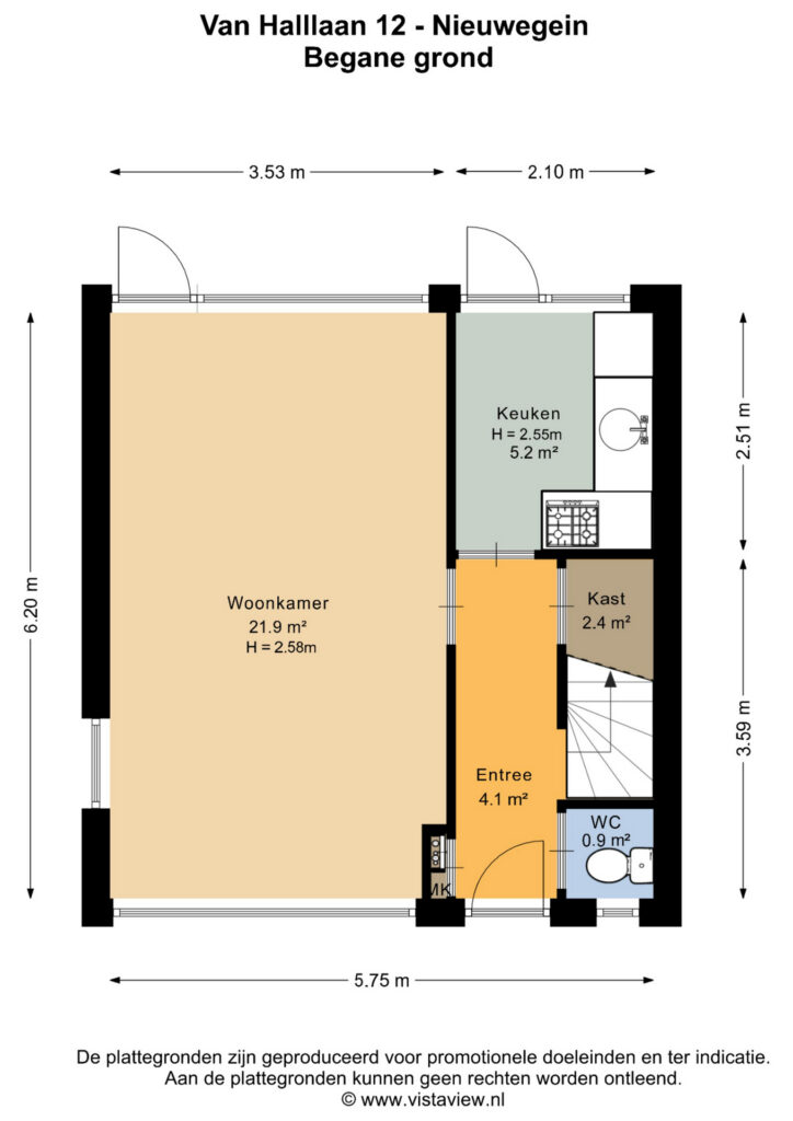 Entree, meterkast, toilet, gang en trapkast. De woonkamer is 22 mΒ² groot en is licht, mede door het zijraam. de keuken is dicht ten opzichte van de kamer en is 5 mΒ² groot.