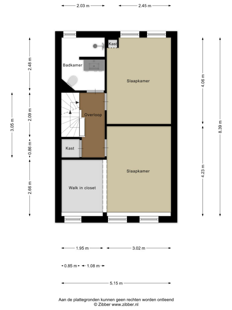De overloop geeft toegang tot twee ruime slaapkamers. De slaapkamer aan de voorzijde beschikt over een comfortabele walk-in closet en biedt de mogelijkheid om hier een extra kamer te realiseren. De badkamer is netjes afgewerkt en voorzien van een tweede toilet, een wastafel met meubel en een inloopdouche. Op de overloop vind je bovendien een praktische inpandige berging.